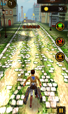 游戏采用全3D引擎打造,场景建模精细还原了动漫中的立体机动装置战斗场景。玩家将操控角色在高低错落的城市建筑间穿梭,面对突然出现的巨人必须及时发动攻击。游戏特别设计了"巨人变身"系统,当能量蓄满时角色可短暂变身为巨人形态,此时可以无视障碍疯狂吞噬金币。四位可操作角色各具特色,包括艾伦、三笠等原作人气角色,每位都拥有专属的立体机动装置和战斗动作。