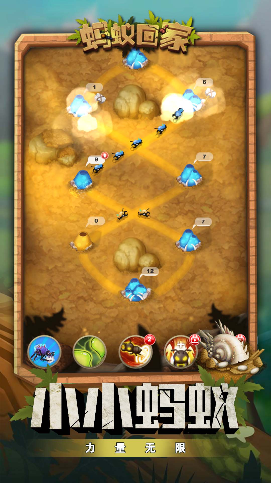 《蚂蚁回家》是一款充满策略与挑战的微观世界模拟游戏,带你深入神秘的蚂蚁王国。在这个奇妙的地下世界中,你将扮演蚂蚁帝国的缔造者,从零开始建立属于你的蚂蚁文明。通过指挥工蚁采集资源、扩建巢穴、培育兵蚁,逐步扩张领地,应对各种自然威胁。游戏采用独特的俯视视角,让你全方位掌控蚁群动态,体验从弱小部落到强大帝国的成长历程。丰富的生态系统和多样化的敌人将考验你的管理能力,每一次决策都可能改变蚁群的命运。