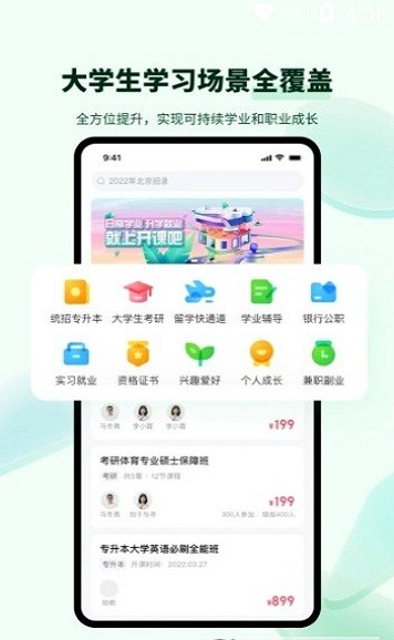 开课吧青春版持续迭代更新,每月新增超过200课时精品内容,目前已有超过50万大学生通过该平台实现学业突破和职业飞跃。其智能学习报告系统能精准追踪学习进度,薄弱环节自动预警,配合专业学管师的全程督导,确保每位用户都能获得最佳学习效果。现在注册还可享受新生专属礼包,包含多门限免课程和职业测评服务,立即下载开启你的高效学习之旅吧!
