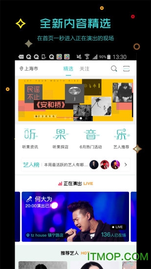 听果音乐以"音乐连接生活"为核心理念,打造了一个集现场演出、艺人互动、活动参与于一体的音乐生态圈。平台汇聚了全国一线城市最具特色的音乐酒吧和LiveHouse资源,邀请众多知名音乐人和实力唱将入驻。无论您喜欢摇滚、民谣、爵士还是电子音乐,都能在这里找到属于自己的音乐天地。听果音乐致力于为每一位用户提供最优质的音乐体验,让音乐不再只是背景音,而是生活中不可或缺的美好元素。