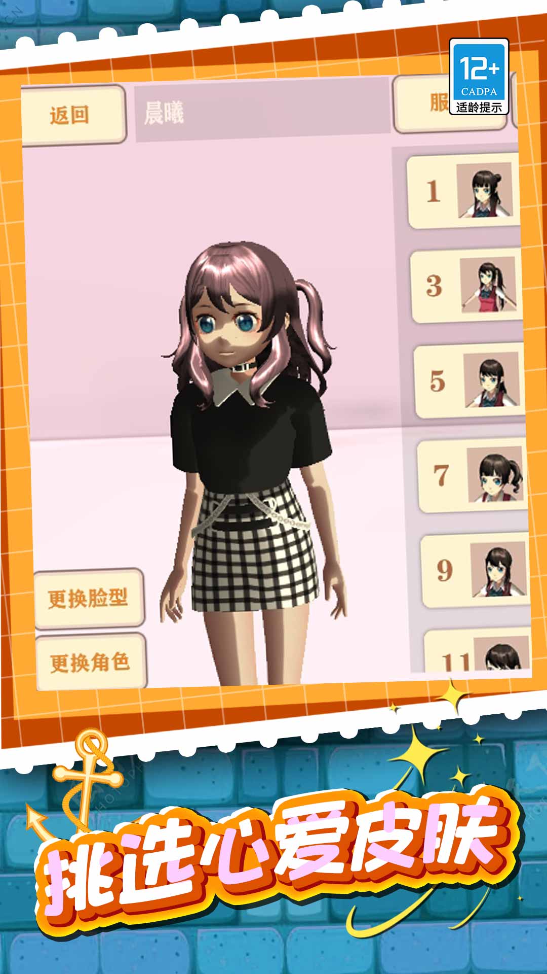 1.角色创建:提供超过100种外观组合选项,玩家可以自定义角色的五官、发型、体型等细节,打造专属校园形象。