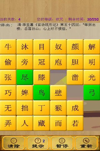 4.玩家需要在限定时间内消除全部36个汉字才能通关。游戏界面下方设有四个功能按钮,分别对应暂停、提示、重新开始和设置等功能。合理使用这些辅助功能可以帮助玩家更好地完成挑战。