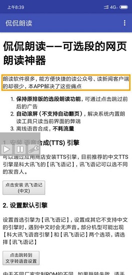 3.自动滚屏(不支持自动翻页),解决系统内置朗读工具只读当前界面的弊端。智能调节滚屏速度,完美匹配语音播报节奏。支持手动暂停和继续,让您完全掌控阅读进度。
