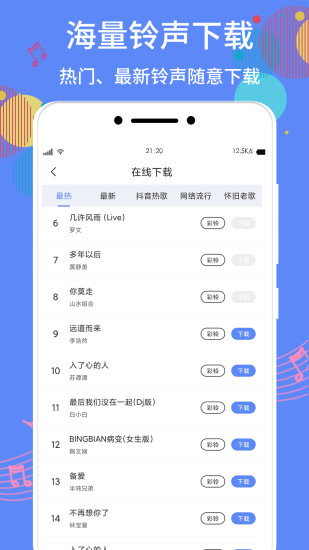 -种类齐全:拥有海量手机铃声资源库,提供热词榜、最热歌曲、最新歌曲等分类。涵盖欧美日韩流行音乐、动漫卡通原声、影视金曲等各类风格,满足不同用户的个性化需求,让您总能找到心仪的铃声。