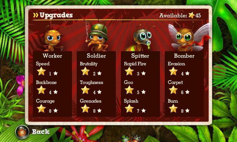 游戏中的四种蚂蚁兵种各具特色:工人负责资源采集,士兵是主力战斗单位,随地吐痰者提供远程支援,轰炸机则负责高伤害输出。合理搭配这些兵种,根据战场情况及时调整战术,是取得胜利的不二法门。完成关卡挑战后获得的星星可以用来强化蚂蚁,让你的军团越来越强大。