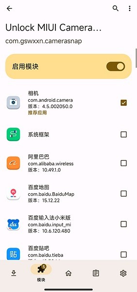 打开LSP/XP框架管理器,找到miui街拍录像模块并激活(如激活后功能失效,请勾选系统框架选项,然后重启手机)