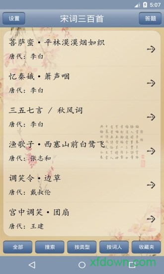 5、收藏管理:支持用户自定义收藏夹功能,可分类管理喜爱的词作,建立个人专属的宋词学习资料库。