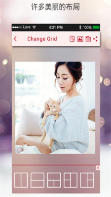 3.很多独特的照片效果:使用它们拼贴模板制作独特的照片拼贴,自动照片编辑工具,汽车的颜色和自动对比度,大量的背景图案,特别开发的"回忆胶片"特效能还原经典相纸质感。