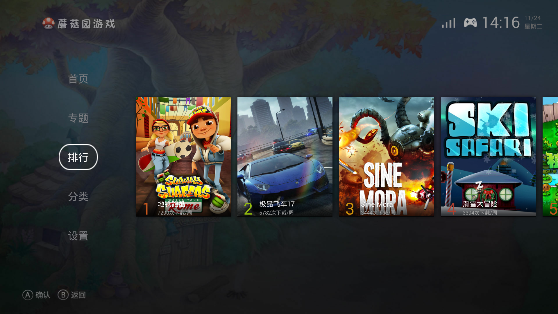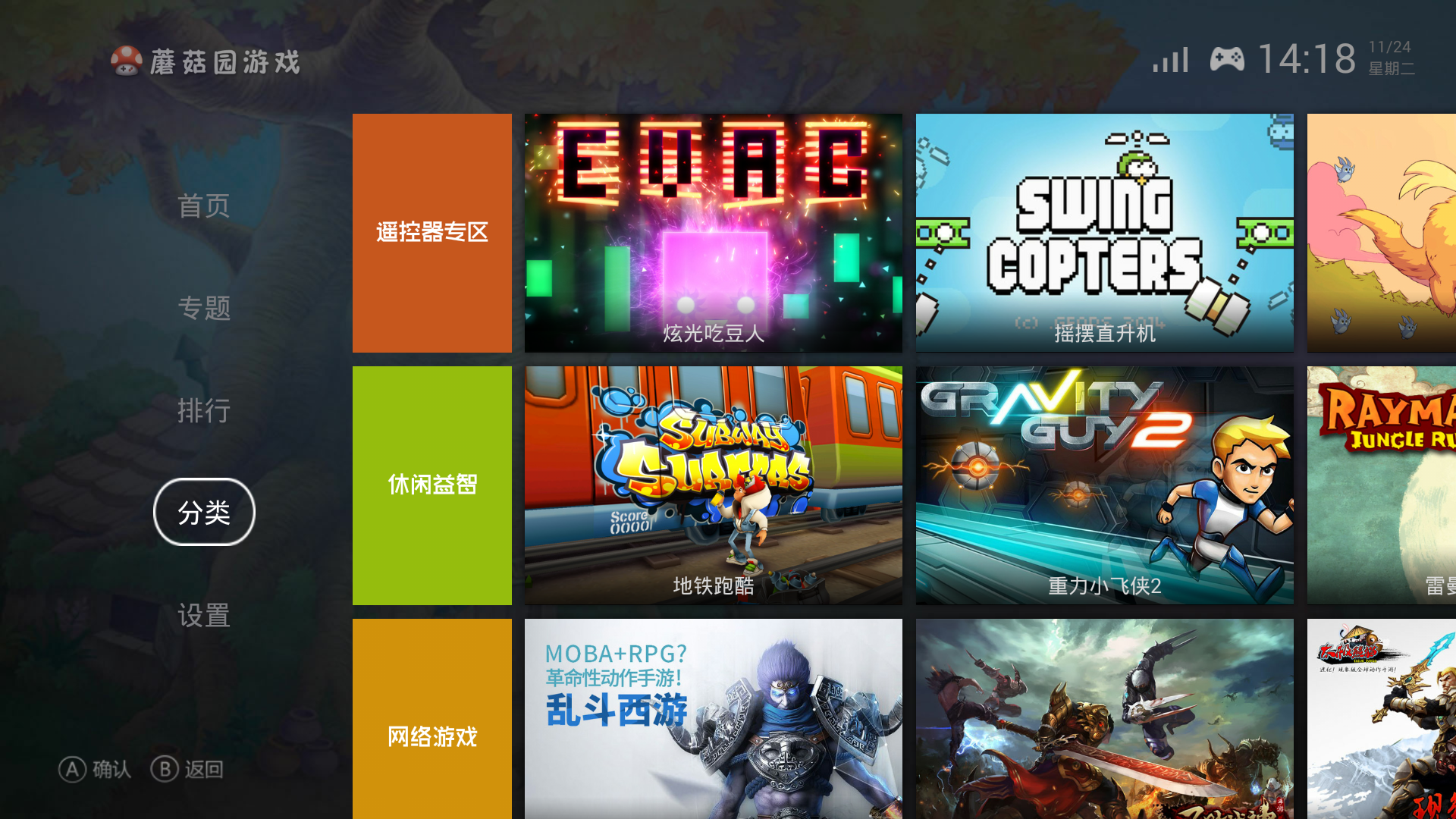 蘑菇园游戏是一款专为智能电视打造的游戏大厅,将您的电视瞬间变身为多功能游戏机。它汇集了海量精品游戏,完美支持手柄操控,让您在家就能享受主机级的游戏体验。无论是单人冒险还是多人对战,蘑菇园都能满足全家人的娱乐需求。平台精选优质游戏,经过专业适配,确保每款游戏都能流畅运行,带来身临其境的视听享受。