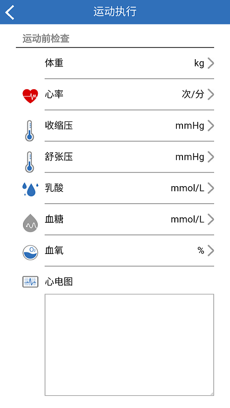 记录病人运动前的相关收缩压、舒张压、血氧饱和度等信息,系统会自动评估当前身体状态是否适合运动