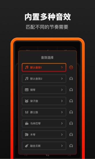 3、内置丰富音效库:包含牛铃音、轻琴音、电报音、架子鼓、中琴音、马林巴琴、木琴、啄木鸟、轻快板、重快板、人声等十余种音效,让练习更加生动有趣。