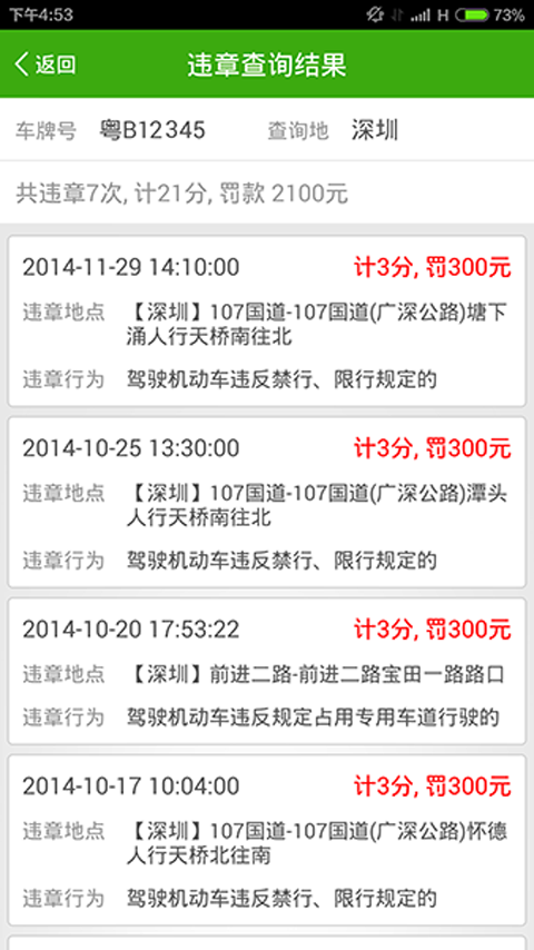 违章详情展示全面,包括违章具体路段、违规行为、发生时间、违章类别等详细信息,同时提供罚款金额、扣分标准以及处理地址等实用信息,帮助您快速了解和处理违章事项。