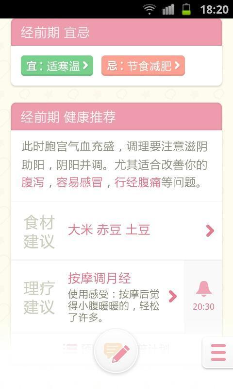 饮食建议——软件提供详细的经期饮食指南,明确列出适宜食用的营养食材和需要避免的禁忌食物。从补血养气的红枣枸杞,到需要忌口的生冷辛辣,让您轻松掌握经期饮食要点,科学调理身体状态。