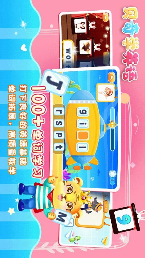 5、学字母:设计教室、黑板、小恐龙老师、学生等的场景,教宝宝进行字母的认读、书写笔顺、组词、英文及实物翻译,模拟真实课堂环境,增强学习代入感。