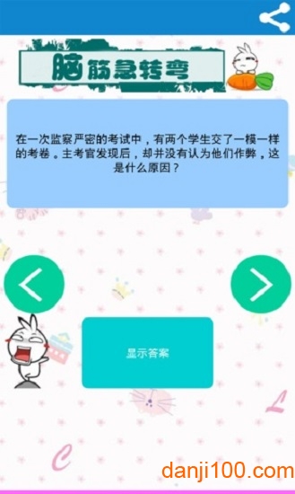 题库持续更新扩容,目前已突破5000道精选题目,涵盖逻辑推理、文字游戏等多元类型。智能随机系统根据用户答题记录优化推荐,每次刷新都能获得个性化题目组合。完全离线的运行模式不仅节省流量,更能在无网络环境下随时畅玩。特别增设的笑话专区包含数百则精选段子,在烧脑之余提供放松选择,双倍快乐一键切换。新增的夜间模式保护视力,让您深夜也能舒适游玩。