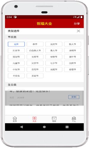 2023节日祝福大全app是一款专为节日问候打造的智能祝福语平台,集传统与现代祝福方式于一体。作为2023年全新升级的祝福工具,它不仅收录了春节、中秋等传统节日祝福语,还囊括了情人节、感恩节等西方节日问候。用户可以通过智能分类快速找到适合不同场合、不同对象的祝福内容,支持一键复制、个性化编辑和即时分享功能。无论是给家人、朋友还是同事发送祝福,都能在这里找到贴心的问候语,让节日祝福变得简单又有心意。