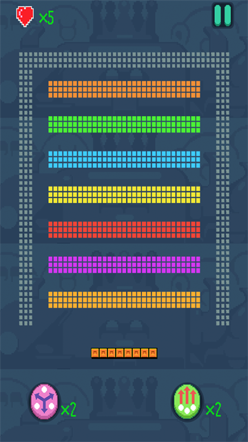 移动挡板接住下落的弹珠,并使其成功反弹上去继续击打方块。挡板可以自由伸缩变换大小,合理利用这一特性能有效提高接球成功率。