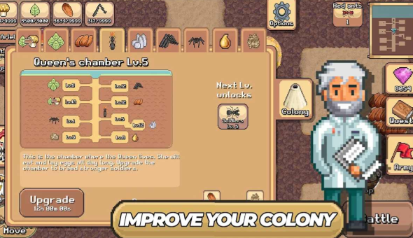 玩家学会完成升级,打造规模更大的蚂蚁军团,解锁好玩的任务。游戏提供了多种经验获取途径,让玩家可以快速提升蚂蚁等级。
