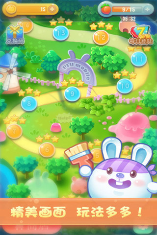 3、超多组合特效与可爱萌兔主角混搭,玩法新颖且乐趣无限。游戏设计了多种特殊果冻和道具,搭配可爱的兔子角色,为玩家带来丰富的游戏体验。