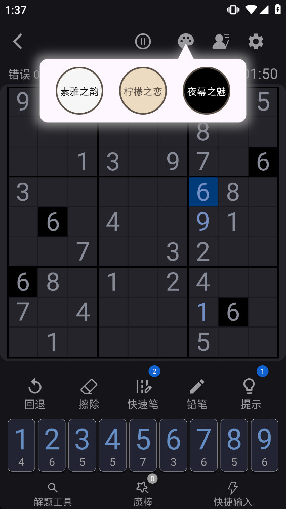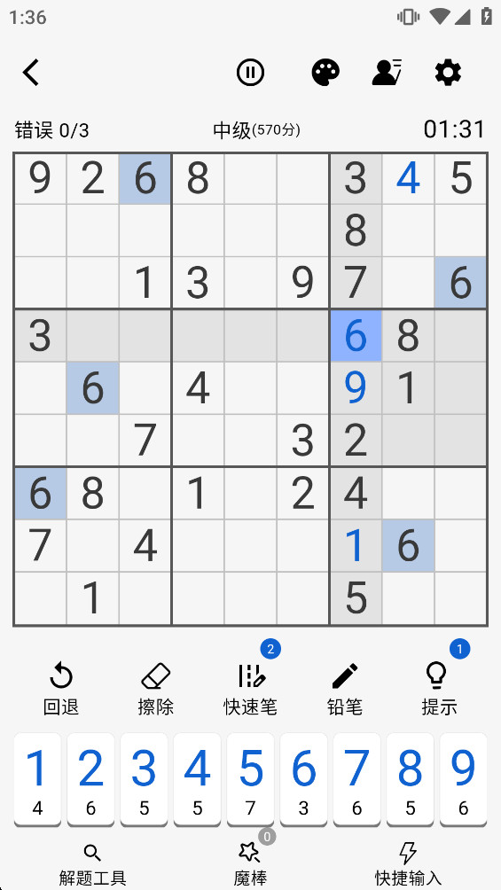 4.选定难度后,系统会随机生成对应的数独题目。你可以使用游戏提供的数字键盘填写空格,系统会自动校验填入的数字是否符合规则,帮助你及时发现错误。