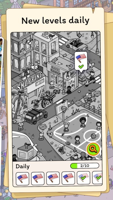 除经典模式外,游戏创新性地加入了"记忆挑战"模式——玩家需先观察完整场景10秒,之后场景会被部分遮蔽,依靠记忆找出物品。"双人对抗"模式支持实时联机对战,双方在相同场景中比拼寻找速度。针对硬核玩家设计的"专家模式"会禁用缩放功能,并设置多层级谜题:找到A物品才能解锁B物品的搜索权限。游戏还内置"禅模式",移除所有UI界面和时间限制,配合ASMR环境音效,打造纯粹的解压体验。