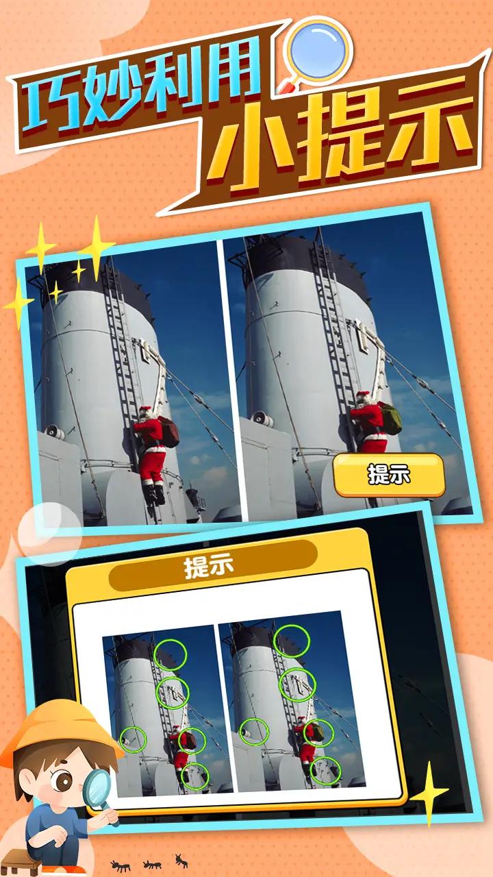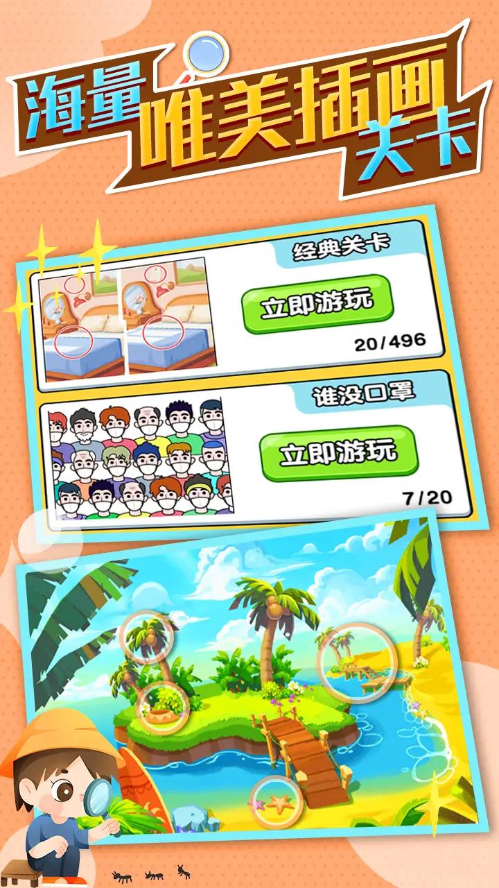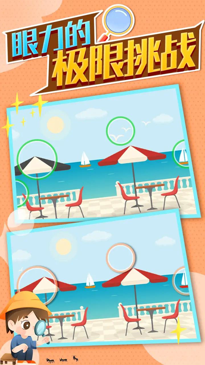 大量的游戏关卡等待着玩家进行挑战,丰富多样的挑战模式需要玩家解锁。游戏采用精美的美术风格,每张图片都经过精心设计,差异点设置巧妙合理。易上手的玩法让玩家获取到无限的欢乐,带给玩家不一样的操作体验。游戏支持离线模式,无需网络也能畅玩,随时随地享受找茬乐趣。每一次的挑战都能够获取到丰富的道具,合理的使用帮助自己快速的化解危机。游戏还设有成就系统和每日任务,激励玩家持续挑战自我。快速的完成其中的任务将会获取到更多的成就,非常的。游戏定期举办主题活动,参与即可获得限定奖励,保持游戏新鲜感和玩家粘性。
