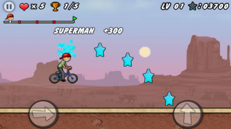 在加速的过程中要注意,由于自行车的助力方式是脚蹬,所以加速的时候要连续点击才能加速。这对于跳跃某些范围比较大的障碍有一定的帮助,此外,游戏内在不同节点设置了存档,路过即会自动存档,不过挑战的机会有限,要把握!