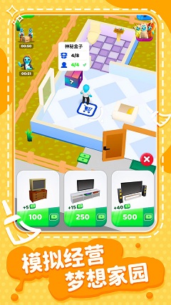 游戏采用精美的3D画面技术,细腻的光影效果和逼真的场景设计,让玩家仿佛置身于真实的房屋改造现场。通过拖拽、旋转等简单操作,你可以轻松摆放家具、更换壁纸,甚至调整房间布局。独特的任务系统将引导你逐步解锁新区域,从破旧小屋到豪华别墅,每一处细节都充满惊喜。在完成主线任务的同时,还能触发随机事件,比如帮助邻居解决装修难题,或参与限时挑战赛,让游戏体验更加丰富多彩。