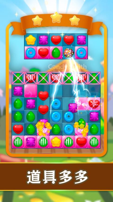 游戏提供了多种功能各异的道具,如彩虹糖可以消除整行糖果,炸弹糖能清除周围区域。这些道具可以通过关卡奖励获得,也能在商店购买。合理使用道具往往能扭转战局,帮助玩家突破难关。