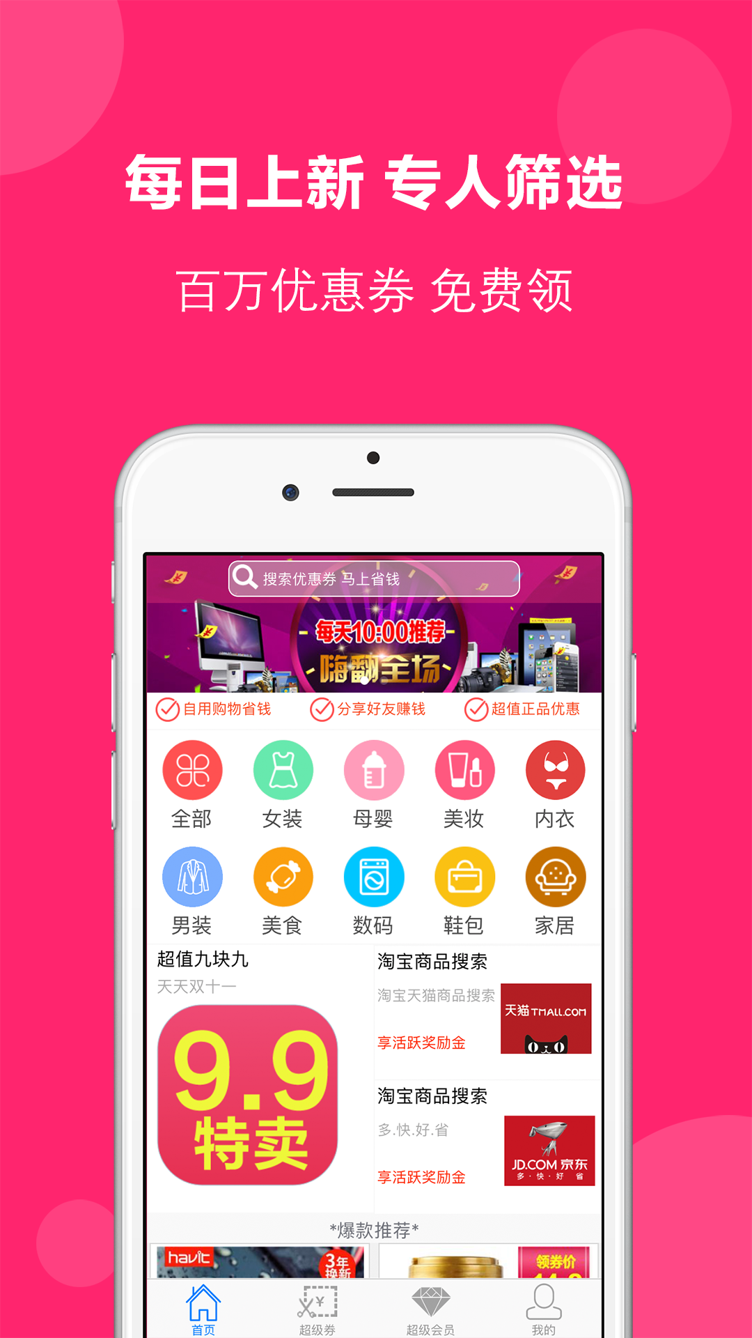 1、新增优惠券智能搜索功能,支持关键词联想和热门推荐。2、新增京东、唯品会优惠券栏目,丰富商品资源库。3、新增天猫超市、天猫国际等频道的一键搜券分享省钱等功能,简化购物流程。4、新增签到领功能,累积签到可兑换精美礼品,及完善用户体验流程。5、增加确认收货授信额度功能,建立信用体系,分享赚钱更人性化。6、优化UI界面,提升操作流畅度。