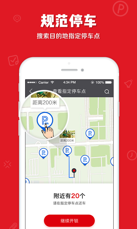 3、更便利-手机扫码开锁,无固定车桩,路边白线内还车,方便省心;支持蓝牙解锁和预约功能,可以提前15分钟锁定心仪车辆,避免被他人骑走。