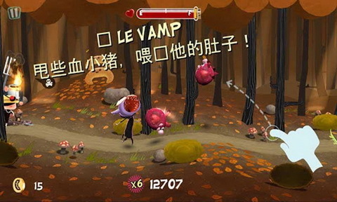 游戏采用了明亮活泼的卡通风格,完全颠覆了传统吸血鬼题材的黑暗基调。虽然故事发生在幽暗的森林中,但设计师巧妙地运用了丰富的色彩对比:金黄的落叶、湛蓝的溪流、鲜红的血小猪,共同构成了一幅生机盎然的秋日画卷。2D横版的设计让场景流畅地横向延伸,角色造型夸张可爱,动作表情生动有趣。特别是当LeVamp遇到危险时那惊慌失措的样子,或是成功逃脱后得意的表情,都让人忍俊不禁。游戏还加入了大量动态效果,比如飘落的树叶、流动的溪水,都让整个画面充满活力。