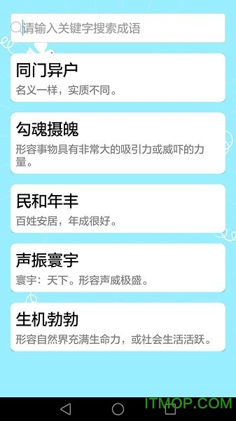 - 每个成语都提供详尽的解析,包括标准发音、准确释义、历史出处、典型例句等内容,帮助用户全面理解成语内涵。