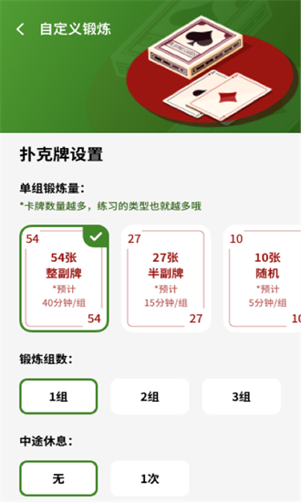 3.自定义锻炼法,不同类型计时法,整副牌高强度训练;半副牌中强度训练,随心定义更适合自己的运动方式!用户可以根据体能状况灵活调整训练强度,从入门级到专业级循序渐进。系统会自动记录每次训练数据,方便追踪进步轨迹。