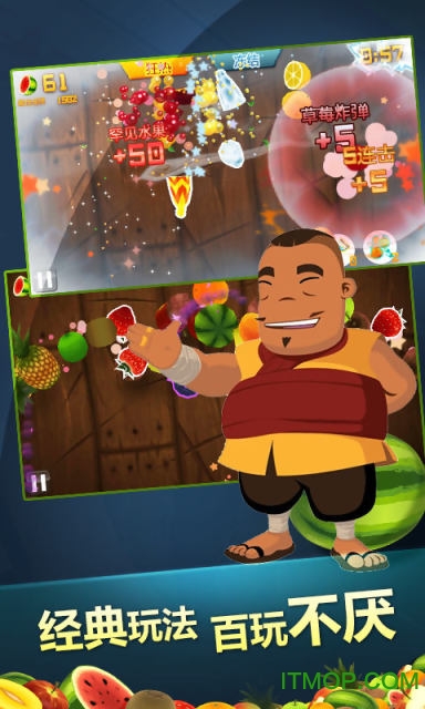 3.丰富道具系统:冰冻炸弹、双倍积分、时间延长等道具助玩家突破高分。道具之间可以产生连锁反应,比如先用冰冻炸弹冻结屏幕上的水果,再使用双倍积分道具,可以最大化得分收益。