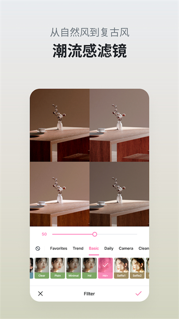 免费滤镜:内置超过200款专业级滤镜,包含胶片、电影、日系等多种风格,所有滤镜均可免费使用且支持强度调节,轻松实现高级感调色。