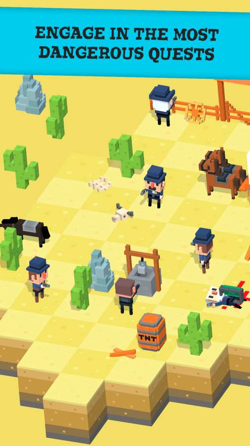 游戏采用创新的方格移动机制,每次滑动屏幕角色就会移动一个方格,点击屏幕即可朝指定方向射击。玩家需要运用策略规划移动路线,在消灭场景内所有敌人后才能开启通往下一关的大门。游戏还加入了独特的通缉系统,当玩家累计一定数量的通缉星时,将会触发警察追捕的特殊关卡。除了要应对敌人的攻击外,还要时刻留意环境中的各种危险,比如突然窜出的毒蛇、受惊狂奔的野马等。这些随机事件让游戏过程充满变数,大大提升了游戏的可玩性和挑战性。
