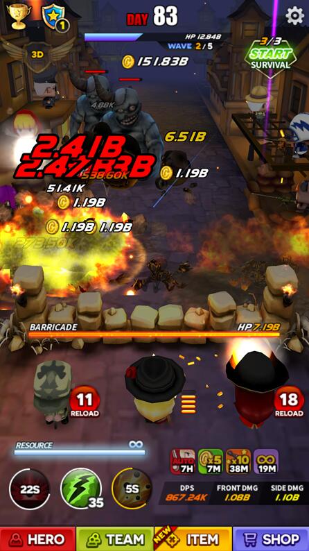 波次式战斗系统,每消灭一波僵尸可获得18秒休整时间,商店大门会开启补给;