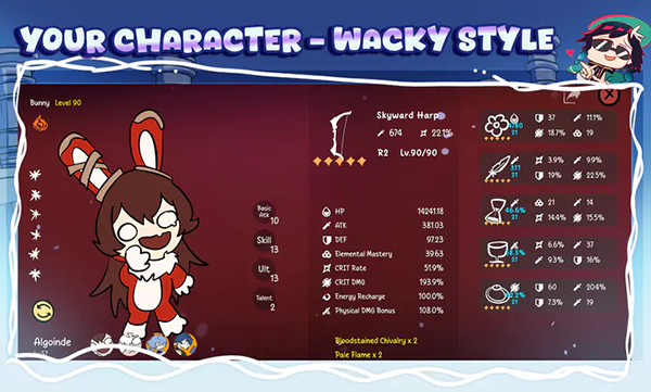 然后可以看到主界面为大聪明版的原神,有着各种版本的角色,形象非常的恶搞。主界面设计充满幽默感,角色们摆出各种夸张姿势,等待你的召唤。