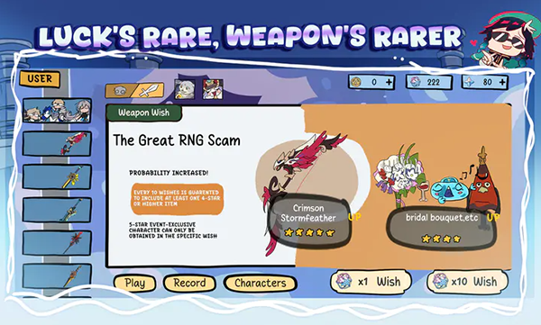 可以自由的抽取四星五星的角色或者是武器,三星的角色这里将会以粑粑的形式出现。游戏特别设计了夸张的角色表现方式,让每一次抽卡都充满戏剧性,即使是抽到低星物品也能会心一笑。
