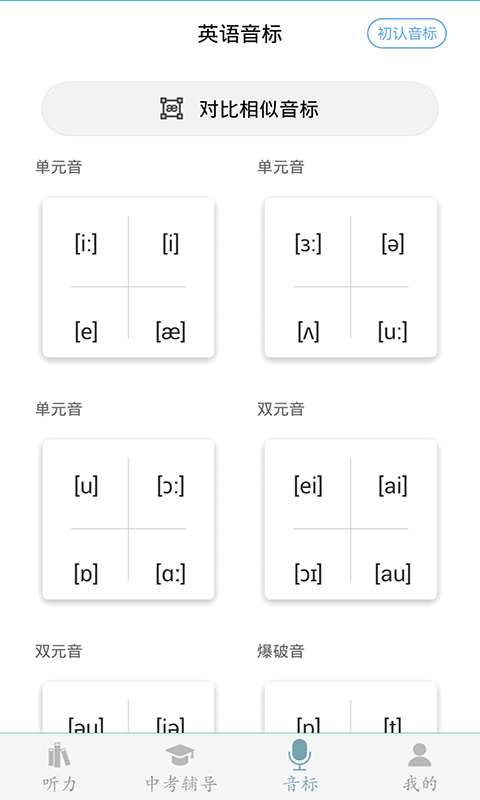 (5)英标,整理了音标的知识,帮助学生改善自己的发音。软件提供标准发音示范和口型动画,学生可以通过跟读练习和录音对比功能,逐步纠正发音问题,培养地道英语发音。
