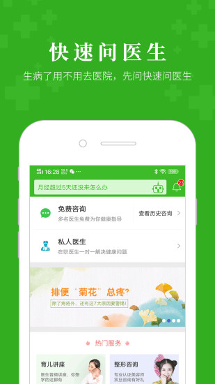 1.问医生:提供最简单快捷的健康咨询通道,支持图文、语音等多种咨询方式,专业医生5分钟内快速响应。