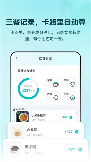 2、设有了饮食热量记录以及热量识别的功能,通过拍照识别三餐的食物,进行记录每日的三餐的热量摄入,自动计算总热量,控制饮食。内置超过10万种食材数据库,支持智能识别2000多种常见菜品。不仅能计算热量,还能分析蛋白质、碳水化合物等营养成分,提供科学的饮食建议。特别设计的营养均衡评分系统,让您轻松掌握每日饮食质量。