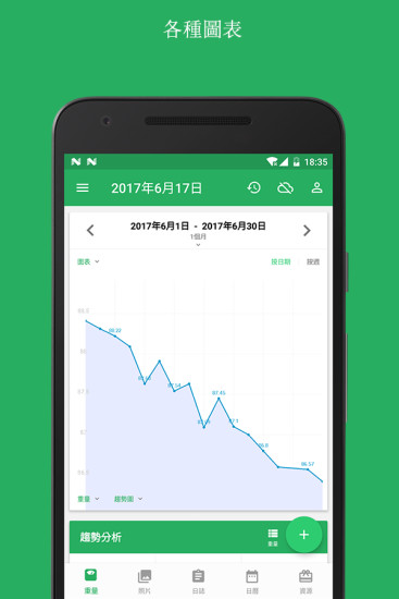 - 动态可视化图表展示,支持折线图、柱状图等多种形式呈现体重变化