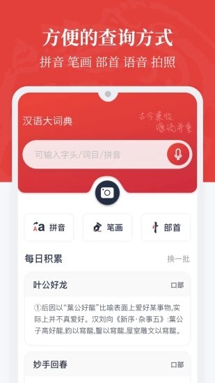 手写输入:支持手写识别,方便输入生僻字。 语音搜索:通过语音输入快速查询,解放双手。 历史记录:自动保存查询记录,便于回顾学习。 成语典故:提供成语背后的故事和出处,增加学习趣味性。 专业术语:涵盖科技、医学、法律等领域的专业词汇。 多语言对照:部分词汇提供英文翻译,适合外语学习者使用。