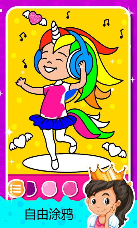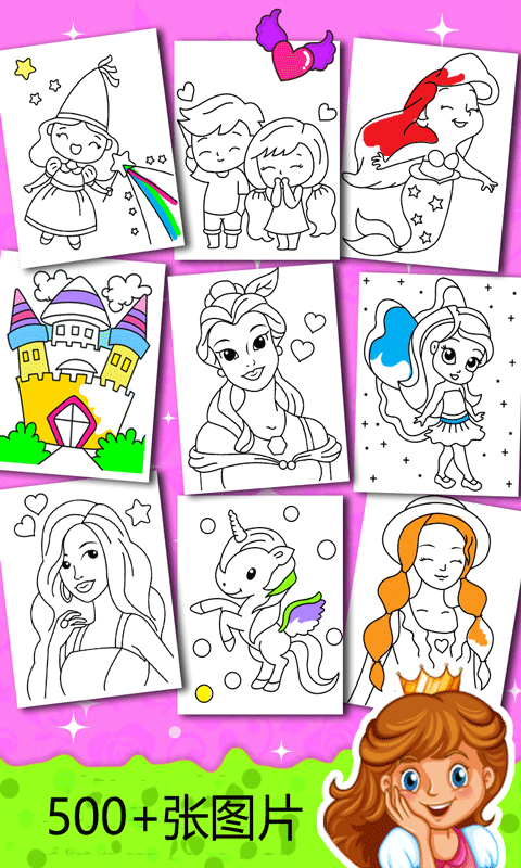 包含公主、王子、皇后、美人鱼、小马、独角兽、美甲的500张彩色图片。游戏提供了丰富的主题选择,满足不同玩家的喜好,让每个人都能找到自己喜欢的涂色内容。