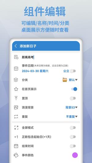 倒数日官网版是一款专注于记录重要日子的实用工具软件,帮助用户轻松管理生活中的各种纪念日、节日、生日和倒计时事件。通过简洁直观的界面,用户可以快速添加、编辑和查看倒计时信息,并支持自定义背景、提醒设置和分类管理。无论是个人日程安排还是团队项目节点,倒数日官网版都能提供精准的时间提醒和美观的展示效果,让用户不错过每一个重要时刻。同时,软件支持多平台同步,确保数据随时随地可访问,是提升时间管理效率的得力助手。