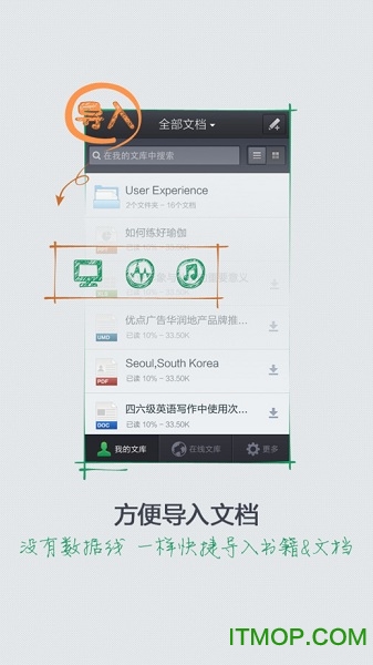 3、多种导入方式:提供电脑无线导入、手机间声音互传、PC百度文库直接上传等多种便捷的文档导入方式,让文件传输更灵活;