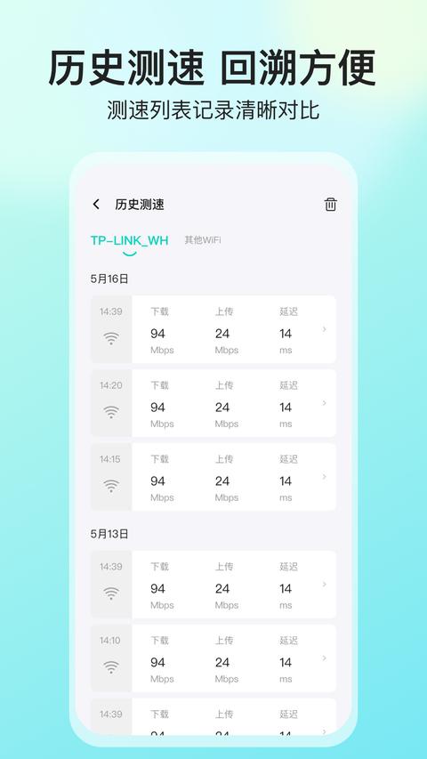 自动保存每次测速记录,方便用户随时查阅和对比历史数据。点击即可查看详细的测速报告,帮助您分析网络变化趋势,优化网络使用策略。历史记录功能让您的网络管理更加科学高效。