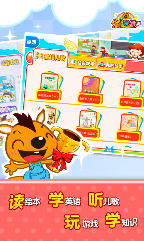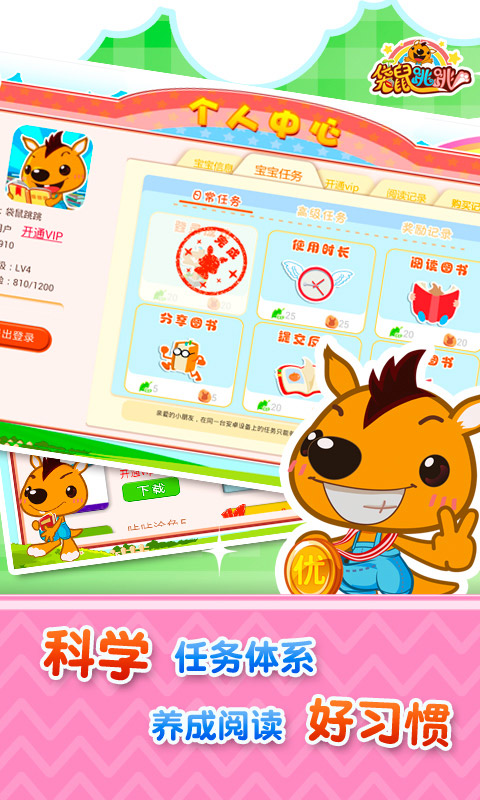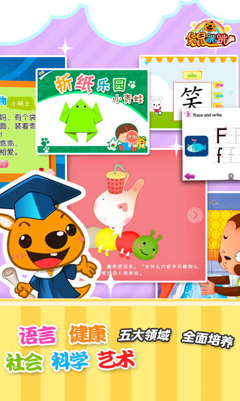 袋鼠跳跳-绘本故事儿歌是一款专注于移动端幼儿教育的优质应用,致力于为0-8岁儿童提供科学、有趣的早教内容。我们通过创新的互动技术和专业的教育体系,帮助孩子在快乐中学习成长。平台汇集了海量精选绘本、儿歌、识字、数学等内容,覆盖语言、认知、社交等五大发展领域,让孩子在阅读中收获知识,在游戏中培养能力。凭借10年幼教行业经验,我们已获得百万家长信赖,成为众多家庭首选的育儿好帮手。